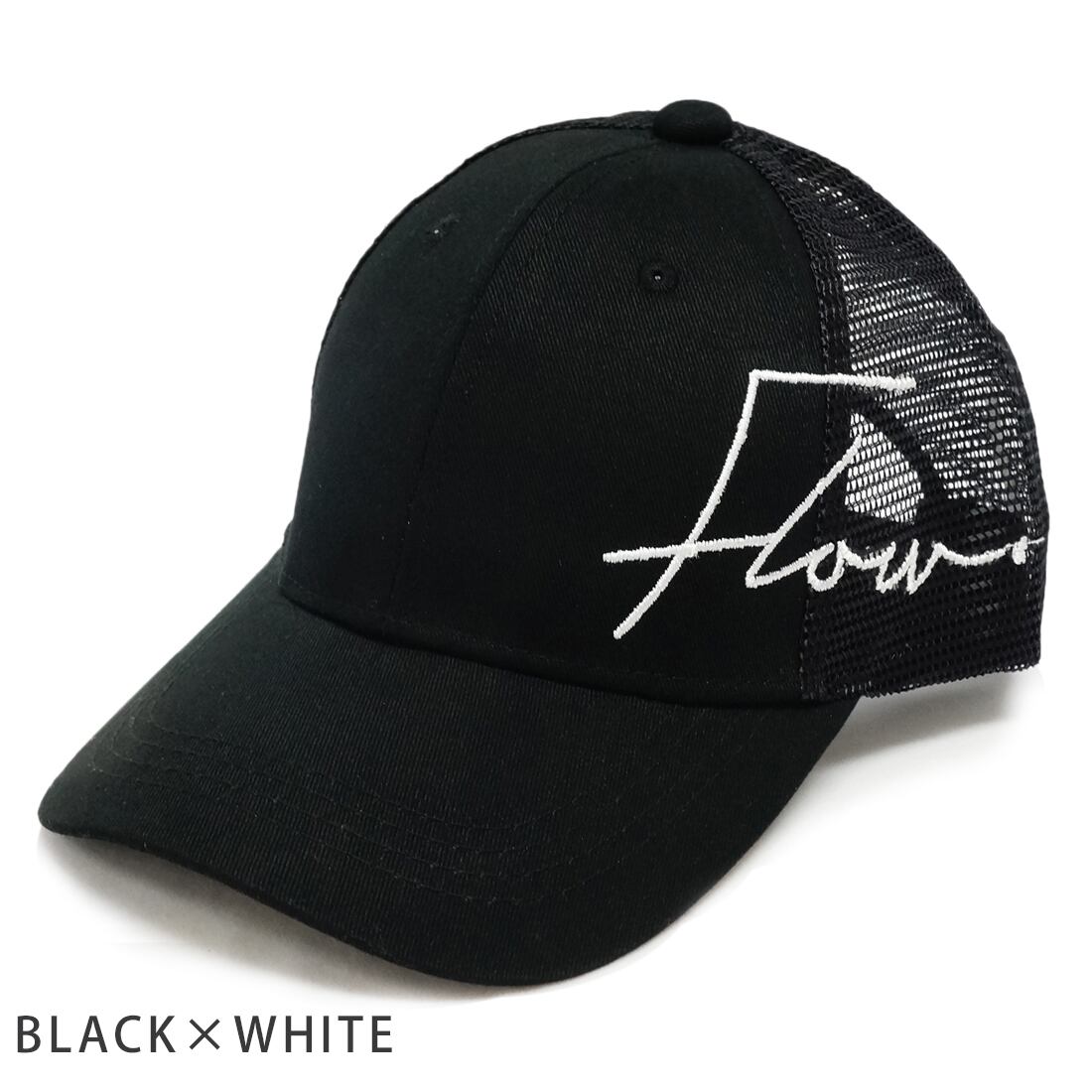 コットン生地とメッシュ生地のサイドに、ロゴ刺繍「Flow」の文字がお洒落なメッシュキャップです。