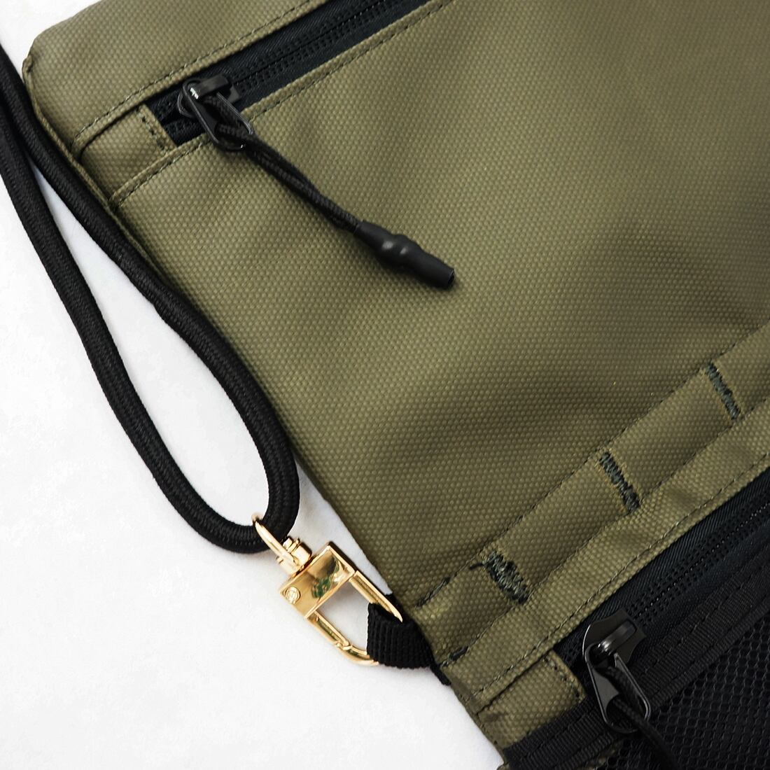 素材は撥水性のあるポリエステル(コーティング)を使用。表面のファスナーは水をはじく撥水ファスナー、生活防水機能を持ったサコッシュバッグです。